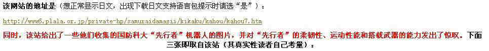 沢山の情報提供本当にありがとうございました 大変ありがたかったです すべて気合を入れてその日のうちに読ませて頂きました ご報告です ●本当に国防科学技術大学のページなのか? この点でしたが半分正解で半分間違いと言う所でした 記事が載っていたサイトは国防科学技術大学の校友会という生徒とOBによる組織のサイトだったようです いわば学校公認の科技大公式サークルと言うところでしょうか ただ中国で学校公認のサークルというのはかなりオフィシャルな面を強く持つので日本のサークルとは意味合いが違います それと科学技術大学のサイトからすぐリンクで飛べるようになっている事を考えるとそれなり地位がある会であると思われるとの報告です ちなみに問題の中華キャノンと侍魂が紹介されていたページは実はその科技大公式サークルのページのTOPページだったそうです(汗) ●どのような内容で書かれていたか? とりあえず侍魂を攻撃しろとか、けしからんとか言う内容ではないです まずは全訳を載せた方が話が早いので下に 学術科学研究室とその成果 1990年に完成した二足歩行ロボットは、『ロボット開発における』国内の遅れを取戻し 国際的な最先端レベルに到達した。 2000年に完成した人間型ロボット『先行者』は、本年度の国家十大科学技術開発の の一つと評価されている。 ある日本語のサイト(*侍魂の事)では、科学技術大学のロボット (そのサイトは中国の最高の科学技術の結晶と考えているが。) とホンダとソニーのロボット(日本最高レベルの代表)を かなり詳細に比較している。これはそのサイトから取った画像である。 左図:本田技研の自立型二足歩行ロボットASIMO 右図:ソニーのSDR-3Xロボット 同時にそのサイトは、彼ら(僕ら日本人の事)が収集した国防科技大学の”先行者”の写真を発表して いる。 また日本人は”先行者”の汎用性、運動性、搭載武器の能力に驚きの声をあげている。 下の三枚の写真はそのサイトから取ったものである。 *この下に中華キャノンの三枚のGIFアニメがあります (この写真が真実かどうかは読者が自分で判断して欲しい) 日本人の目に映った”先行者”ロボット という訳である*代表的っぽい訳から抜粋 文章そのものは翻訳していただいた日本人の方も外国人の方も両方ほぼ上と同じ内容でした とりあえず見てのとおり悪意はありません、それどころかむしろ好意的な印象を受けます 簡単に言ってしまうならば日本ではこんな風に我らが作った先行者が話題になっているよという事です しかしただ一点意見が割れております 最後にこの写真が真実かどうかは読者が自分で考えろとありますが それはこれを載せた中国人の方が どこまで本気か どこまで冗談かと言う事です すべて本気という人 半分冗談で半分本気にしてるいう人 全部冗談で面白がって載せているという人 たくさんの意見がありまして私には分かりません それにそれを結論づけるためには少々材料が足らないように思えます とりあえず中国語が読めない私にはどちらなのかを言及するつもりはありません ここで色々突っ込んだ意見を公開して万が一にもヤブヘビだったら洒落になりません せっかく好意的な感じで紹介していただいているのだから解釈はそれでいいです そんなわけで当面の危機は去ったわけなんですが、科技大サイトからリンクがあることは変わりませんのでここを見た別の中国人の方がどういった印象を抱くのかはまったく分からないわけでして少々心配ではあります しかしそれを言うなら日本人でも先行者の紹介のされ方が許せない方もいるわけで、日本人だろうが中国人だろうがなに人だろうが洒落の分からない人は分からないのでそこはしょうがないなと思います とりあえず、すぐにどうこうという訳ではなく本当に安心しました 沢山のメールありがとうございました この度の騒ぎで本当に沢山の国の方に見ていただいているんだなと実感 中でも嬉しかったのが中国人の方からの好意的なメッセージでした 実は先行者ネタで笑ってくれた中国の方は結構沢山います 名前は匿名ですがある中国からの留学生の方には、侍魂の先行者の紹介で沢山の中国人と日本人が一緒に笑った事実をふまえてそれはまぎれもない日中友好だとまで言ってくださいましたありがとうございます もちろん今回の騒ぎで侍魂を知ってその逆の反応をする中国の方も沢山いるのは事実でしたがそれは別に日本人も一緒ですから仕方ないです それと台湾にかなりの侍魂読者がいることが判明しました 今回翻訳してくださった国別ランキングでは日本を除ければトップでしたありがとうございました いつか行ってみたい国です、その時は台湾オフでもしますか 笑 さてと後は今回の騒ぎの翻訳と応援以外の面白いメール紹介 >今度のヒットマンは国ですね >ヒットマン事件簿(中国編)楽しみにしてます イヤすぎ(泣) >先行者にもアフロをかぶせてくださいね 先行者のゲームでワン教官に怒られてばかり